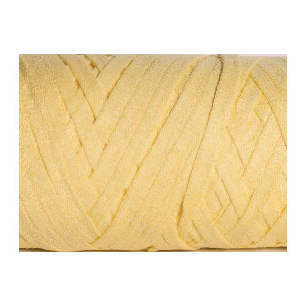 Stužková směsová pletací nebo i háčkovací příze (60% bavlna 40% polyester) v jednobarevné žluté barvě. Je vhodná hlavně na různé bytové a módní doplňky. Doporučená velikost jehlic 10 mm a háčku 10 mm.