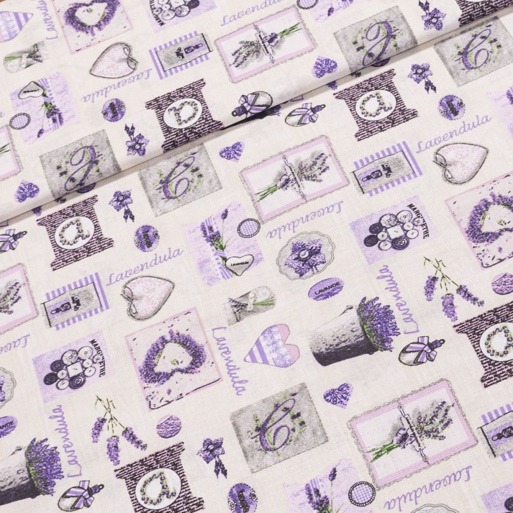 Bavlněná látka (tkanina) se vzorem květin levandule v květináči a srdíček na smetanovém pozadí. Látka je v šířce 140 cm, vyrobena ze 100% bavlny (gramáž 135g/m2) v plátnové vazbě. Vzor látky je natištěn jen z jedné strany z druhé strany je látka bez potisku.