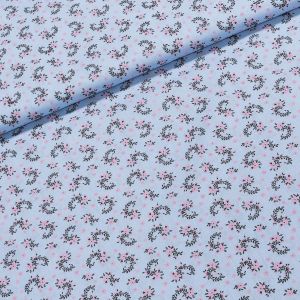 Bavlněná látka (tkanina) se vzorem růžových a vínových kvítků s vlnkami na bílém podkladu. Látka je v šířce 140 cm, vyrobena ze 100% bavlny (gramáž 135g/m2) v plátnové vazbě. Vzor látky je natištěn jen z jedné strany z druhé strany je látka bez potisku.