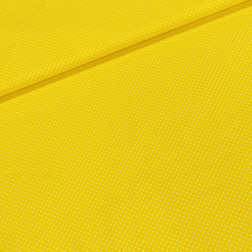 Bavlněná látka (tkanina) s motivem drobných bílých puntíků na žlutém podkladu. Látka je v šířce 150 cm, vyrobena ze 100% bavlny (gramáž 135g/m2) v plátnové vazbě. Vzor látky je natištěn jen z jedné strany z druhé strany je látka bez potisku.