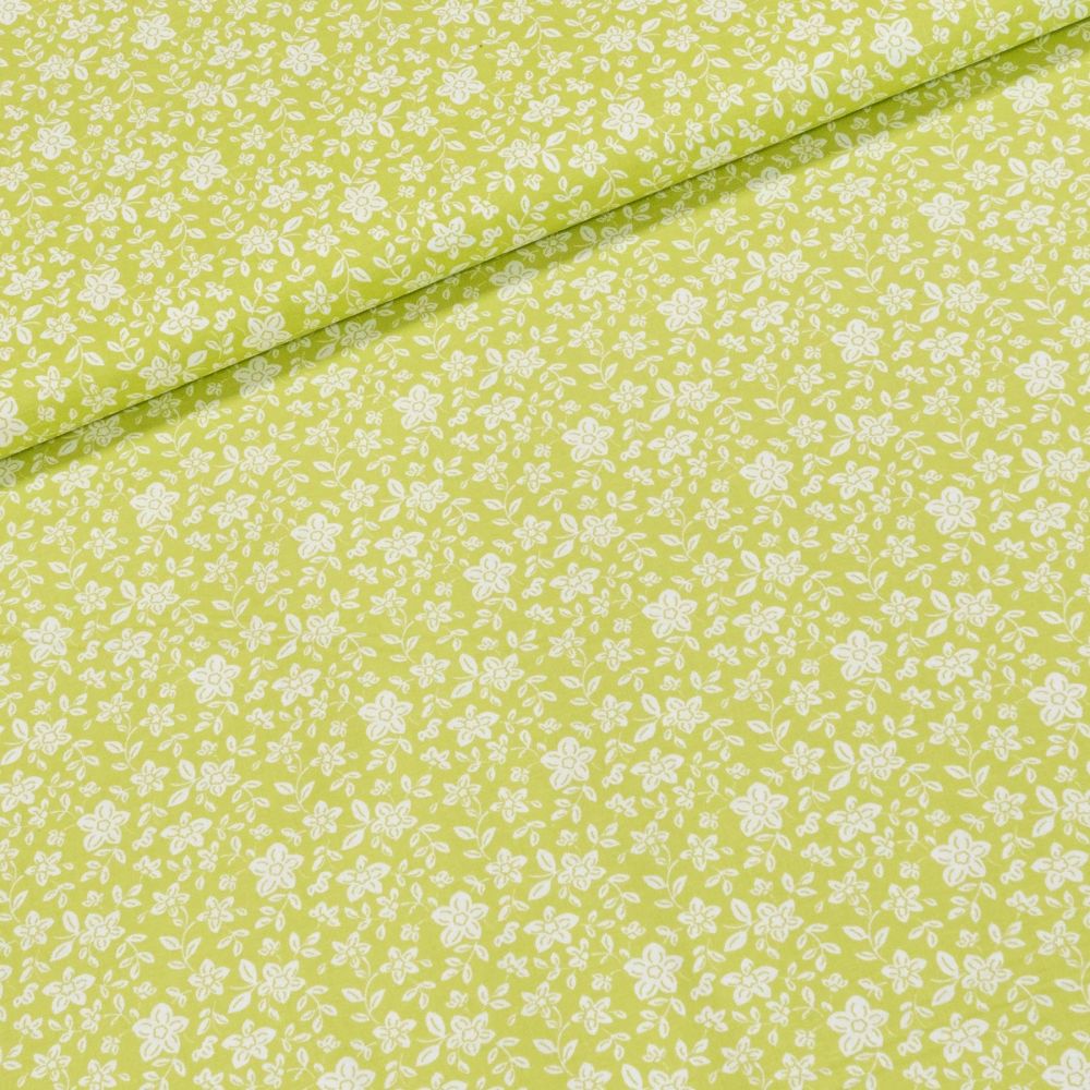 Bavlněná látka (tkanina) s motivem bílých květinek na jarně zeleném podkladu. Látka je v šířce 150 cm, vyrobena ze 100% bavlny (gramáž 135g/m2) v plátnové vazbě. Vzor látky je natištěn jen z jedné strany z druhé strany je látka bez potisku.