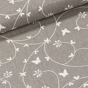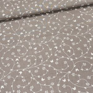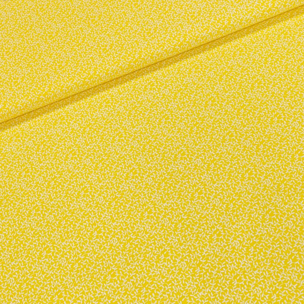 Bavlněná látka (tkanina) s motivem drobných bílých lístečků na žlutém podkladu. Látka je v šířce 150 cm, vyrobena ze 100% bavlny (gramáž 135g/m2) v plátnové vazbě. Vzor látky je natištěn jen z jedné strany z druhé strany je látka bez potisku.