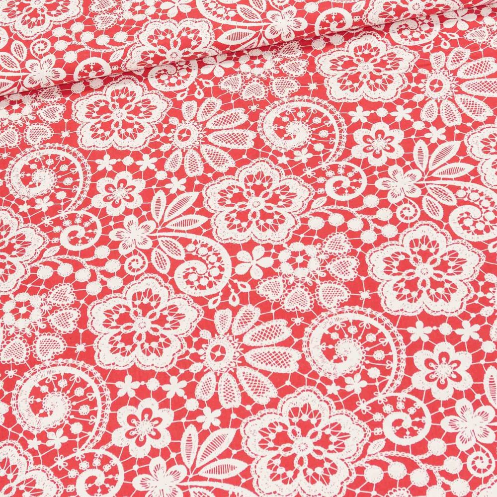 Bavlněná látka (tkanina) s krajkovým vzorem v bílé barvě na červeném podkladu. Látka je v šířce 150 cm, vyrobena ze 100% bavlny (gramáž 135g/m2) v plátnové vazbě. Vzor látky je natištěn jen z jedné strany.