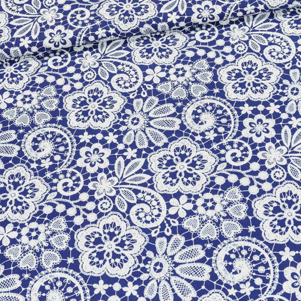Bavlněná látka (tkanina) s krajkovým vzorem v bílé barvě na modrém podkladu. Látka je v šířce 150 cm, vyrobena ze 100% bavlny (gramáž 135g/m2) v plátnové vazbě. Vzor látky je natištěn jen z jedné strany.