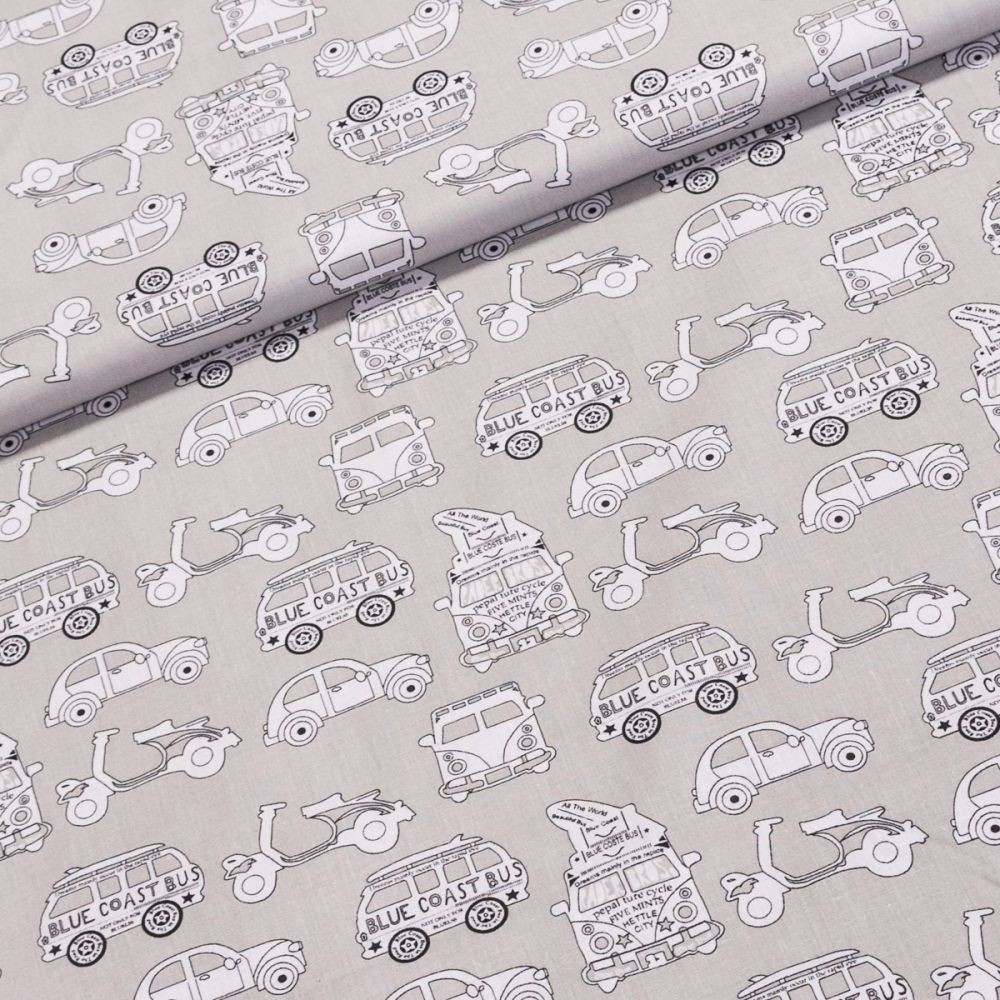 Bavlněná látka (tkanina) se vzorem retro aut, autobusů a motorek na šedém podkladu. Látka je v šířce 140 cm, vyrobena ze 100% bavlny (gramáž 135g/m2) v plátnové vazbě. Vzor látky je natištěn jen z jedné strany z druhé strany je látka bez potisku.