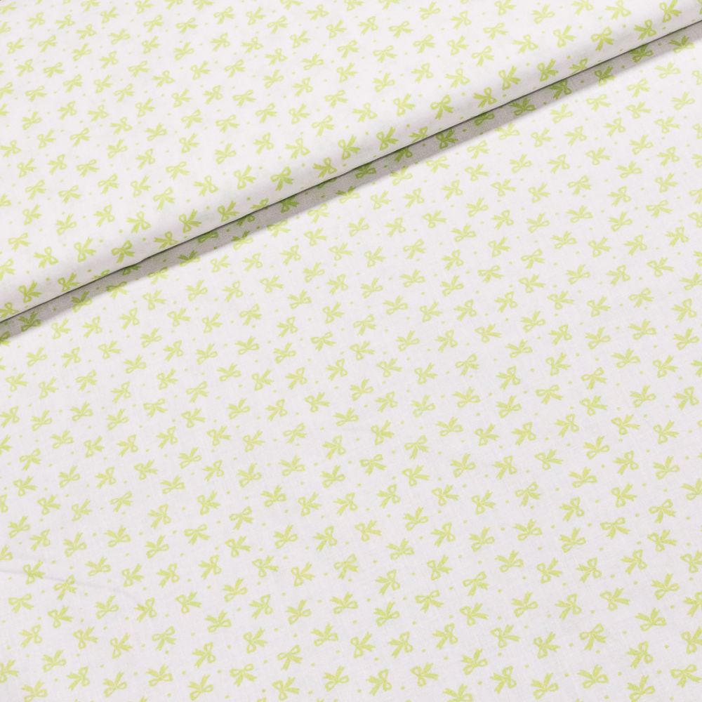 Bavlněná látka (tkanina) se vzorem zelených mašliček na bílém podkladu. Látka je v šířce 140 cm, vyrobena ze 100% bavlny (gramáž 135g/m2) v plátnové vazbě. Vzor látky je natištěn jen z jedné strany z druhé strany je látka bez potisku.