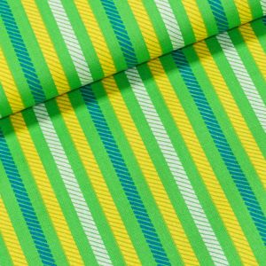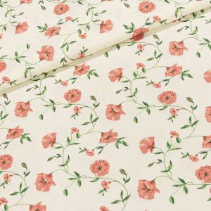 Bavlněná látka (tkanina) s jarním vzorem kopretin na zeleném podkladu. Látka je v šířce 160 cm, vyrobena ze 100% bavlny (gramáž 145g/m2) v plátnové vazbě. Vzor látky je natištěn jen z jedné strany z druhé strany je látka bez potisku.