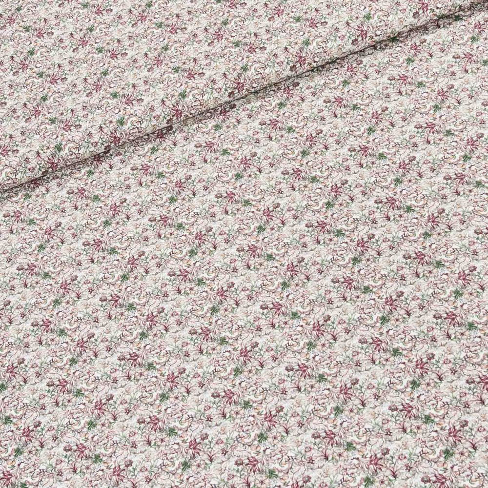 Bavlněná látka (tkanina) se vzorem hustě tištěných květin v zelených a vínových barvách. Látka je v šířce 160 cm, vyrobena ze 100% bavlny (gramáž 135g/m2) v plátnové vazbě. Vzor látky je natištěn jen z jedné strany z druhé strany je látka bez potisku.