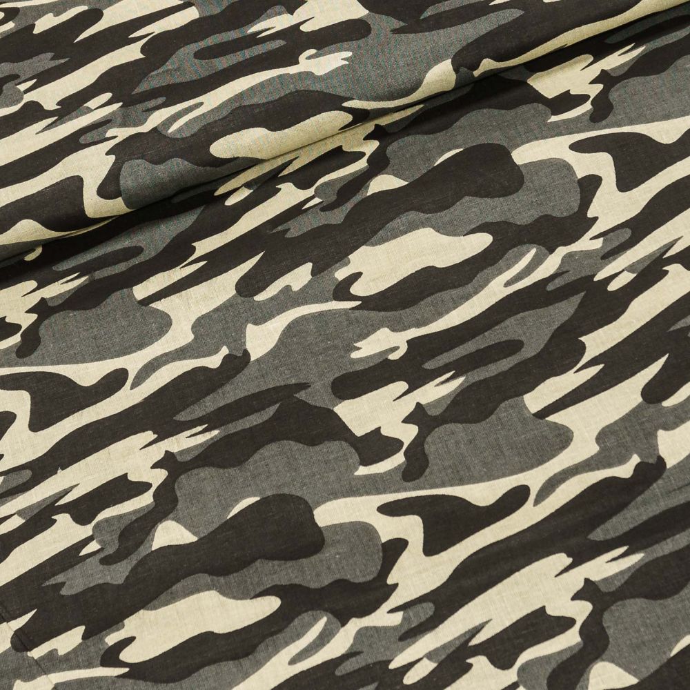 Bavlněná látka (tkanina) s maskáčovým vzorem v šedo-béžových barvách. Látka je v šířce 140 cm, vyrobena ze 100% bavlny (gramáž 125g/m2) v plátnové vazbě. Vzor látky je natištěn jen z jedné strany.