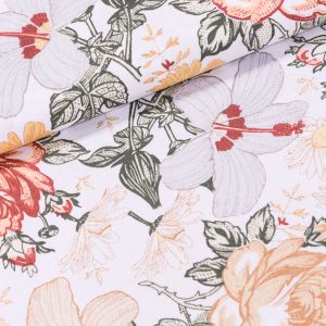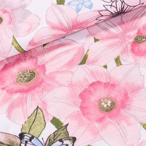 Bavlněná látka (tkanina) se vzorem růžových růžiček na bílém podkladu. Látka je v šířce 140 cm, vyrobena ze 100% bavlny (gramáž 120g/m2) v plátnové vazbě. Vzor látky je jen z jedné strany, z druhé strany je bez potisku.