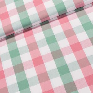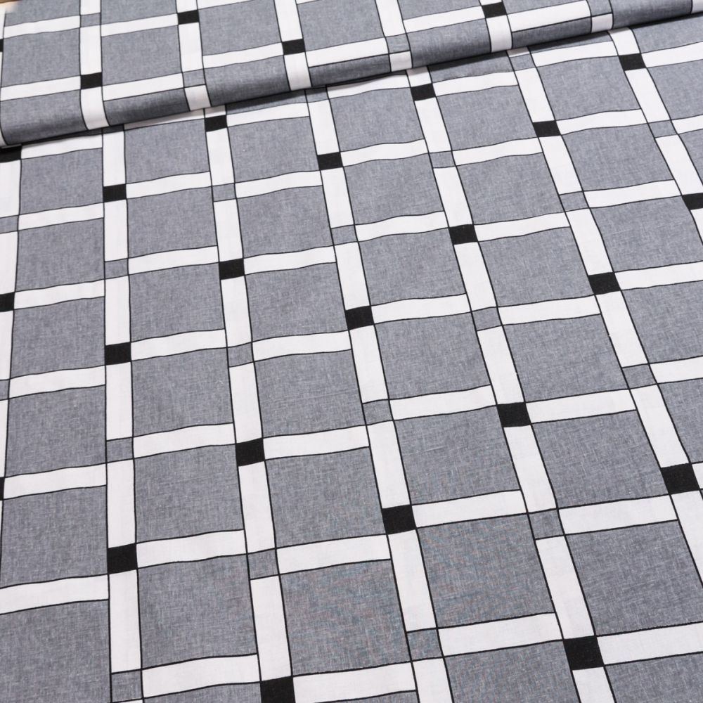 Bavlněná látka (tkanina) se vzorem šedo-bílých velkých kostek. Látka je v šířce 160 cm, vyrobena ze 100% bavlny (gramáž 135g/m2) v plátnové vazbě. Vzor látky je natištěn jen z jedné strany z druhé strany je látka bez potisku.