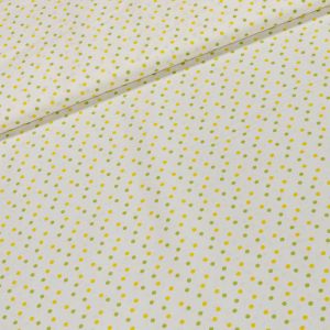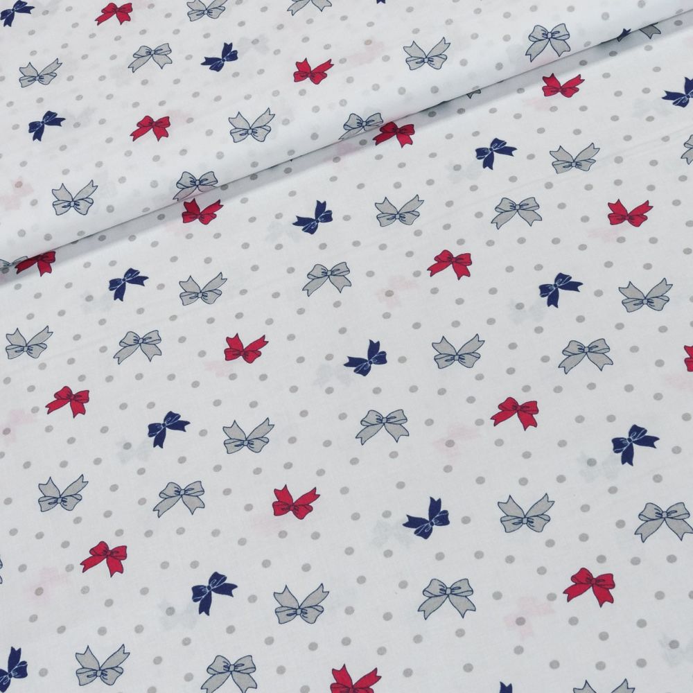 Bavlněná látka (tkanina) se vzorem šedých, modrých a červených mašliček na bílém podkladu s šedými puntíky. Látka je v šířce 160 cm, vyrobena ze 100% bavlny (gramáž 135g/m2) v plátnové vazbě. Vzor látky je natištěn jen z jedné strany z druhé strany je látka bez potisku.