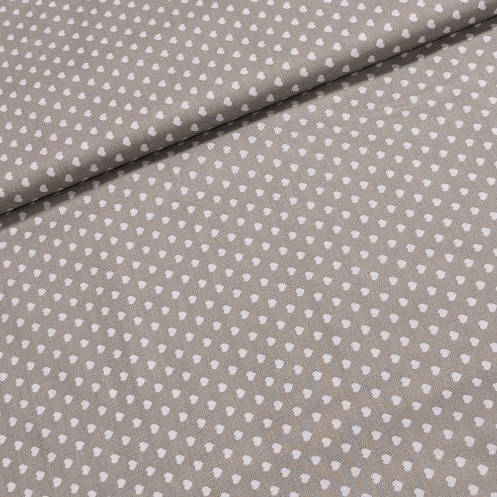 Bavlněná látka (tkanina) s motivem bílých srdíček na šedém podkladě. Látka je v šířce 140 cm, vyrobena ze 100% bavlny (gramáž 135g/m2) v plátnové vazbě. Vzor látky je natištěn jen z jedné strany z druhé strany je látka bez potisku.