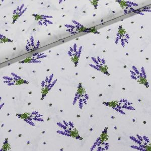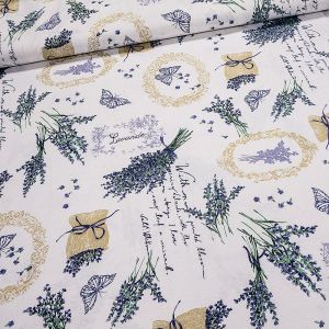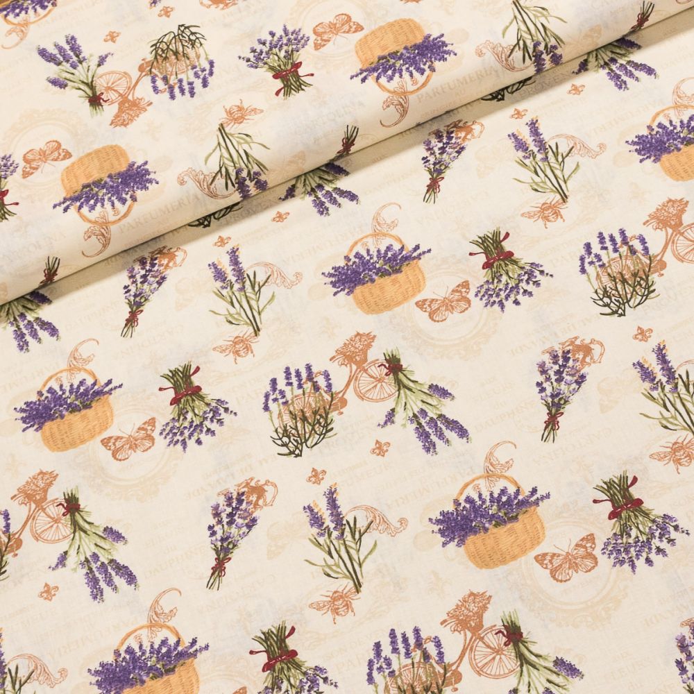 Bavlněná látka (tkanina) se vzorem květů levandule v košíku a kola na béžovém podkladu. Látka je v šířce 140 cm, vyrobena ze 100% bavlny (gramáž 135g/m2) v plátnové vazbě. Vzor látky je natištěn jen z jedné strany z druhé strany je látka bez potisku.