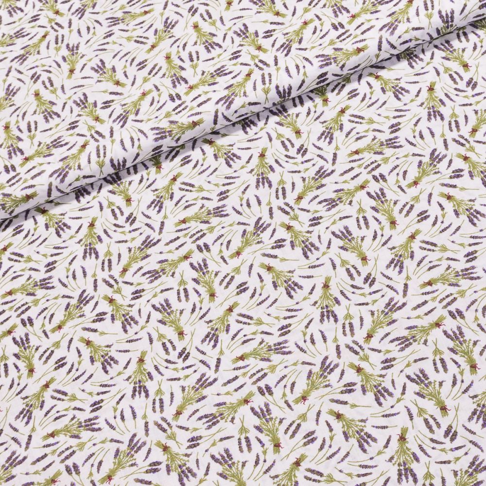 Bavlněná látka (tkanina) se vzorem drobných svázaných květů levandule na bílém podkladu. Látka je v šířce 140 cm, vyrobena ze 100% bavlny (gramáž 135g/m2) v plátnové vazbě. Vzor látky je natištěn jen z jedné strany z druhé strany je látka bez potisku.