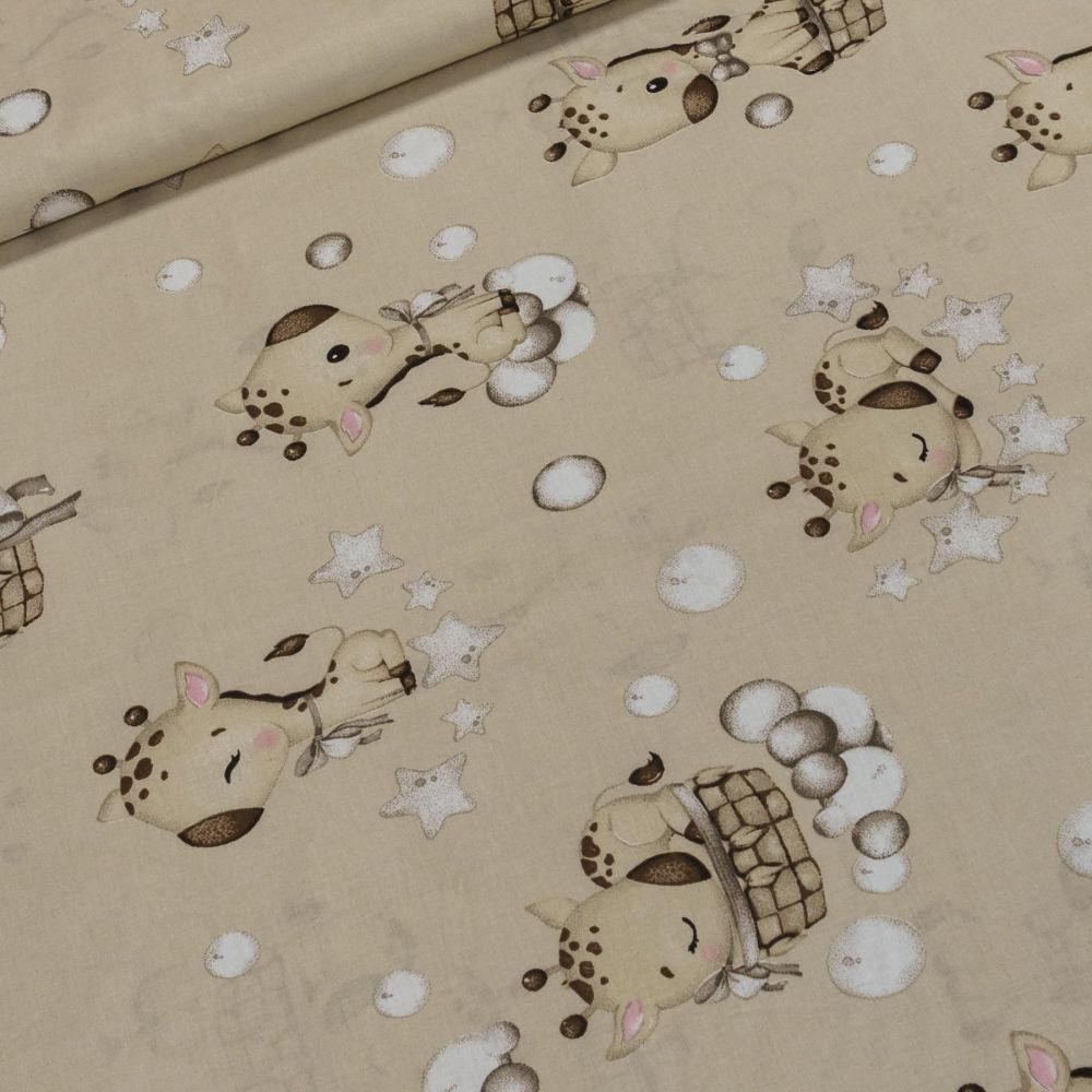 Bavlněná látka (tkanina) se vzorem roztomilých malých žirafek na béžovém podkladu. Látka je v šířce 160 cm, vyrobena ze 100% bavlny (gramáž 135g/m2) v plátnové vazbě. Vzor látky je natištěn jen z jedné strany z druhé strany je látka bez potisku.