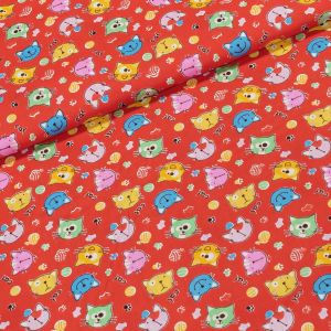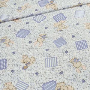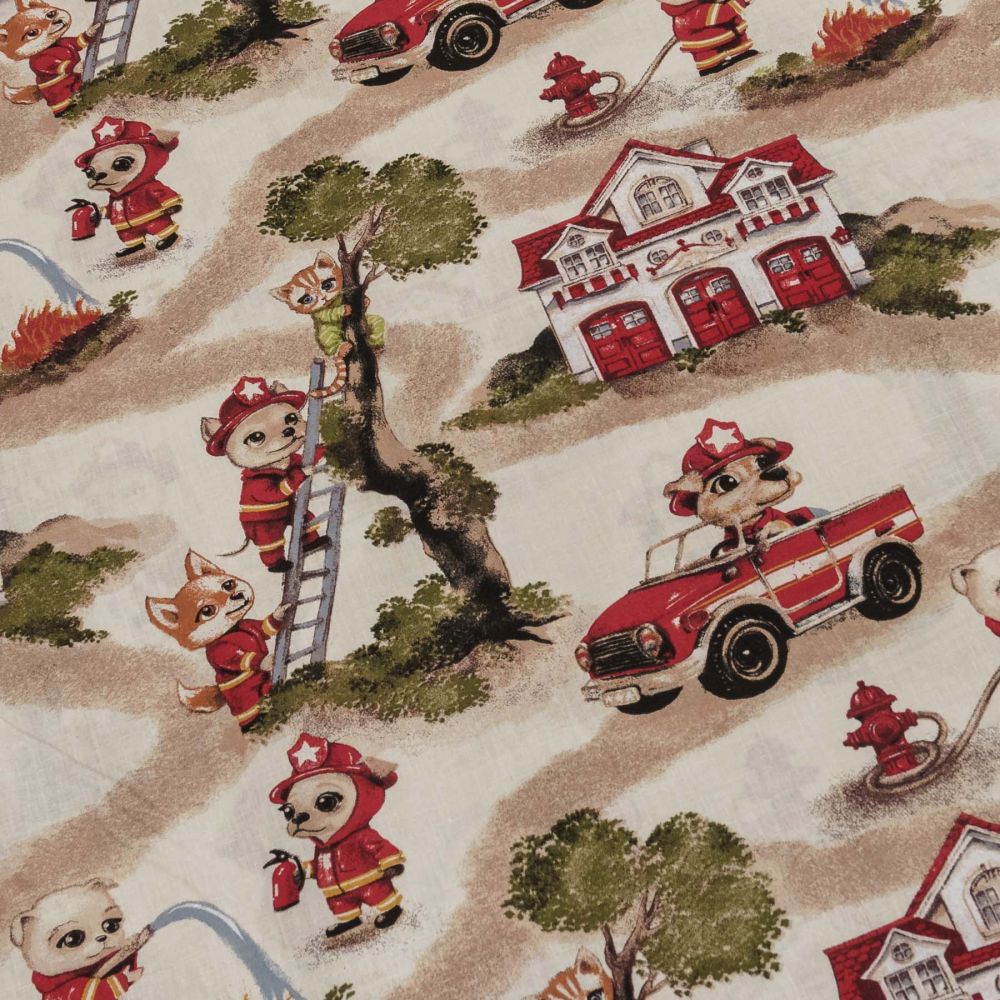 Bavlněná látka (tkanina) se vzorem pejsků jako zachraňujících hasičů na béžovém podkladu. Látka je v šířce 160 cm, vyrobena ze 100% bavlny (gramáž 135g/m2) v plátnové vazbě. Vzor látky je natištěn jen z jedné strany z druhé strany je látka bez potisku.