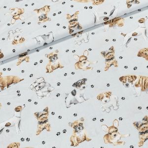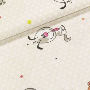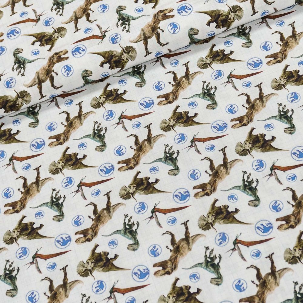 Bavlněná látka (tkanina) se vzorem dinosaurů a loga Jurského parku na bílém pozadí. Látka je v šířce 150 cm, vyrobena ze 100% bavlny (gramáž 120g/m2) v plátnové vazbě. Vzor látky je natištěn jen z jedné strany z druhé strany je látka bez potisku.