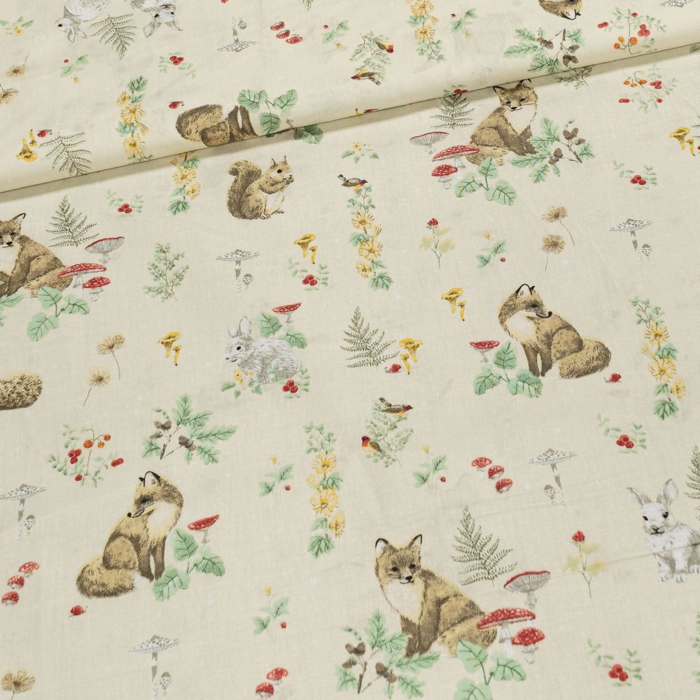 Bavlněná látka (tkanina) se vzorem lesních zvířátek s hříbky na krémovém podkladu. Látka je v šířce 160 cm, vyrobena ze 100% bavlny (gramáž 135g/m2) v plátnové vazbě. Vzor látky je natištěn jen z jedné strany z druhé strany je látka bez potisku.