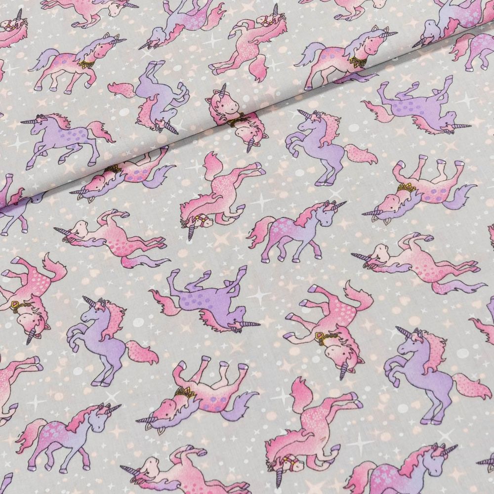 Bavlněná látka (tkanina) se vzorem růžových a fialových jednorožců na šedém podkladu. Látka je v šířce 140 cm, vyrobena ze 100% bavlny (gramáž 135g/m2) v plátnové vazbě. Vzor látky je natištěn jen z jedné strany z druhé strany je látka bez potisku.