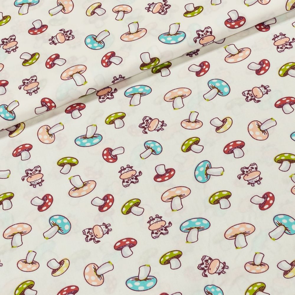 Bavlněná látka (tkanina) se vzorem barevných muchomůrek a kraviček na smetanovém podkladu. Látka je v šířce 160 cm, vyrobena ze 100% bavlny (gramáž 135g/m2) v plátnové vazbě. Vzor látky je natištěn jen z jedné strany z druhé strany je látka bez potisku.