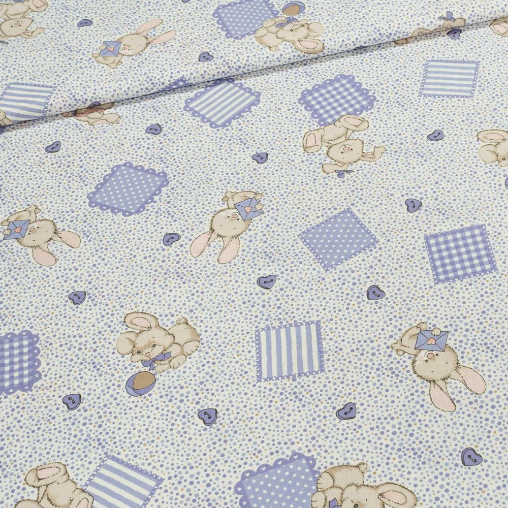 Bavlněná látka (tkanina) se vzorem zajíčků na podkladu s fialovými puntíky. Látka je v šířce 140 cm, vyrobena ze 100% bavlny (gramáž 135g/m2) v plátnové vazbě. Vzor látky je natištěn jen z jedné strany z druhé strany je látka bez potisku.