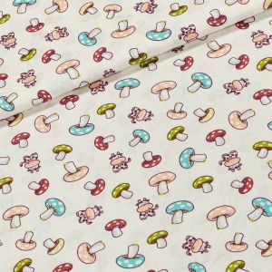 Bavlněná látka (tkanina) se vzorem zvířátek na béžovém podkladu se srdíčky. Látka je v šířce 140 cm, vyrobena ze 100% bavlny (gramáž 135g/m2) v plátnové vazbě. Vzor látky je natištěn jen z jedné strany z druhé strany je látka bez potisku.