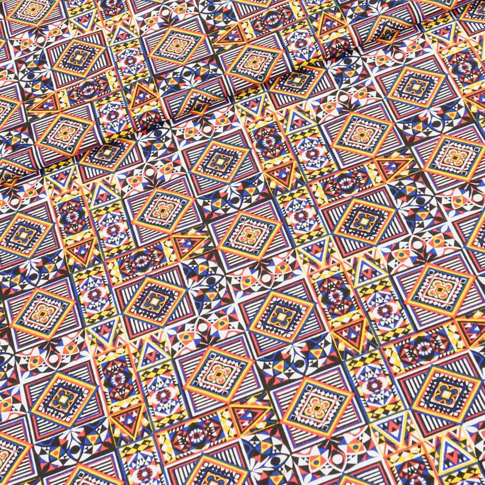 Bavlněná látka (tkanina) se vzorem geometrických vzorů v modro-oranžových barvách. Látka je v šířce 140 cm, vyrobena ze 100% bavlny (gramáž 120g/m2) v plátnové vazbě. Vzor látky je jen z jedné strany, z druhé strany je bez potisku.