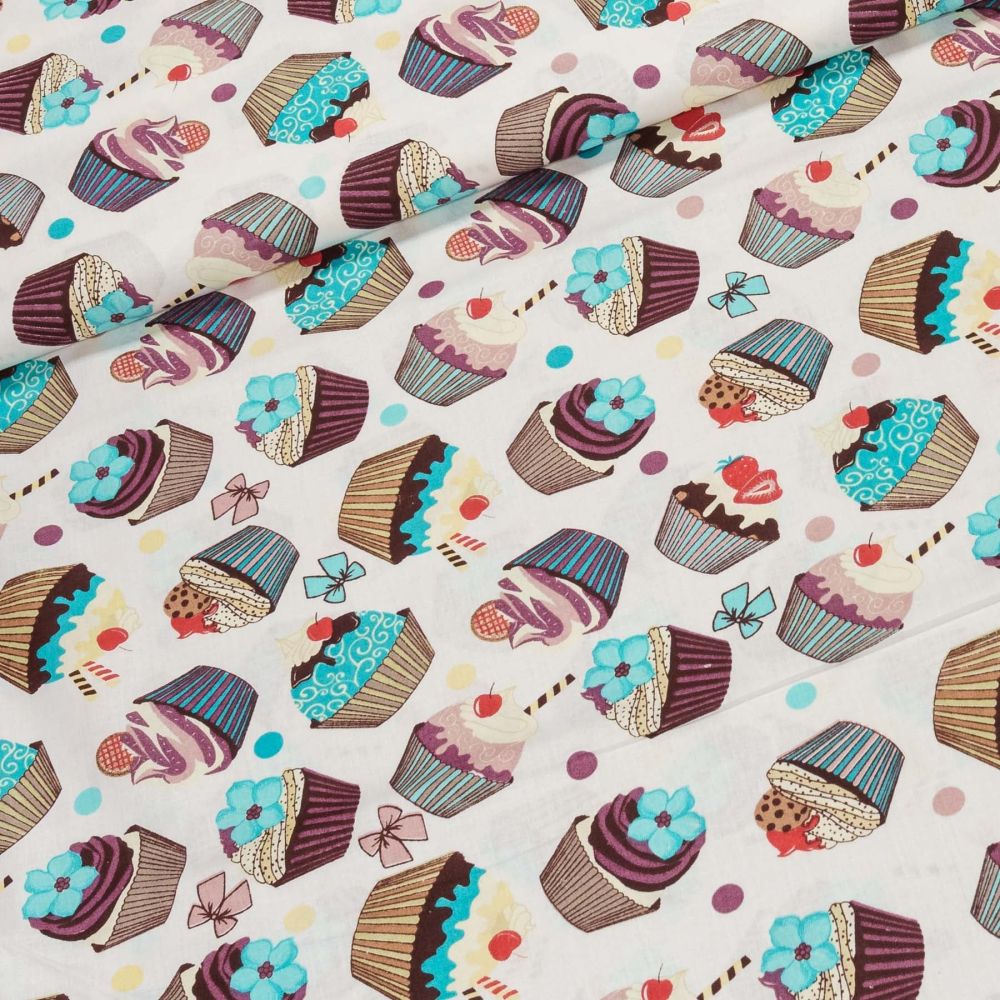 Bavlněné plátno EMA modré, růžové a hnědé muffiny na bílé, š.140cm (látka v metráži)
