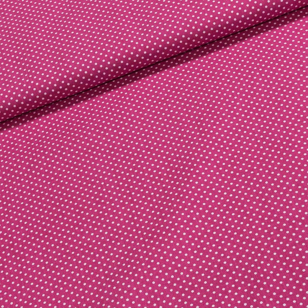 Bavlněná látka (tkanina) s motivem bílých puntíků 2 mm na sytě růžovém pozadí. Látka je v šířce 150 cm, vyrobena ze 100% bavlny (gramáž 135g/m2) v plátnové vazbě a je potištěná jen z jedné strany z druhé je bez potisku.