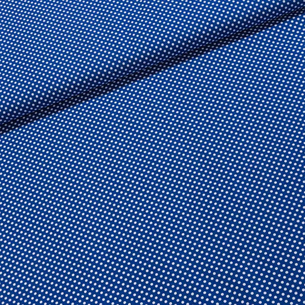 Bavlněná látka (tkanina) s motivem bílého puntíku na královsky modrém podkladu. Látka je v šířce 160 cm, vyrobena ze 100% bavlny (gramáž 135g/m2) v plátnové vazbě. Vzor látky je natištěn jen z jedné strany z druhé strany je látka bez potisku.