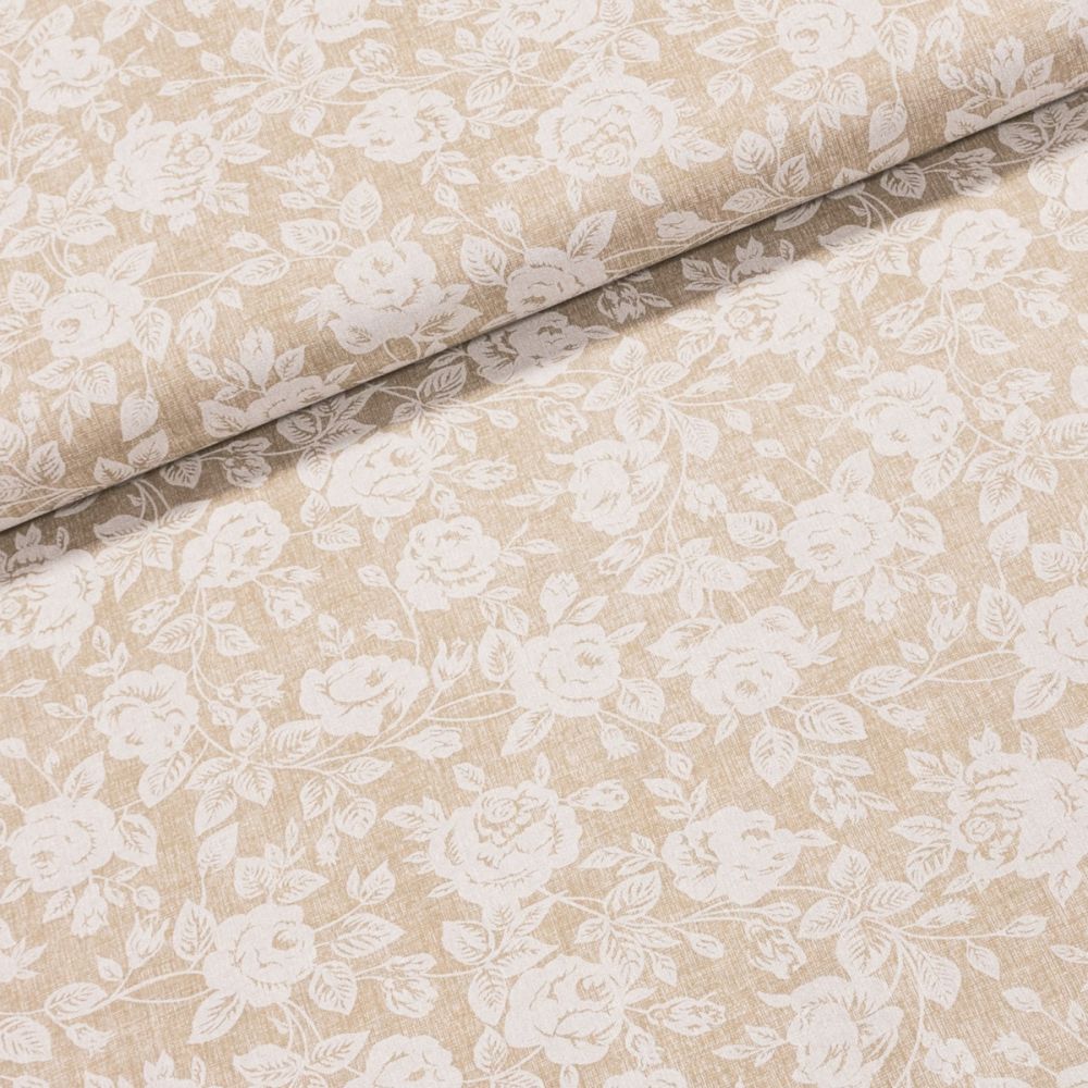 Bavlněná látka (tkanina) se vzorem bílých růží na béžovém podkladu. Látka je v šířce 140 cm, vyrobena ze 100% bavlny (gramáž 135g/m2) v plátnové vazbě. Vzor látky je natištěn jen z jedné strany z druhé strany je látka bez potisku.