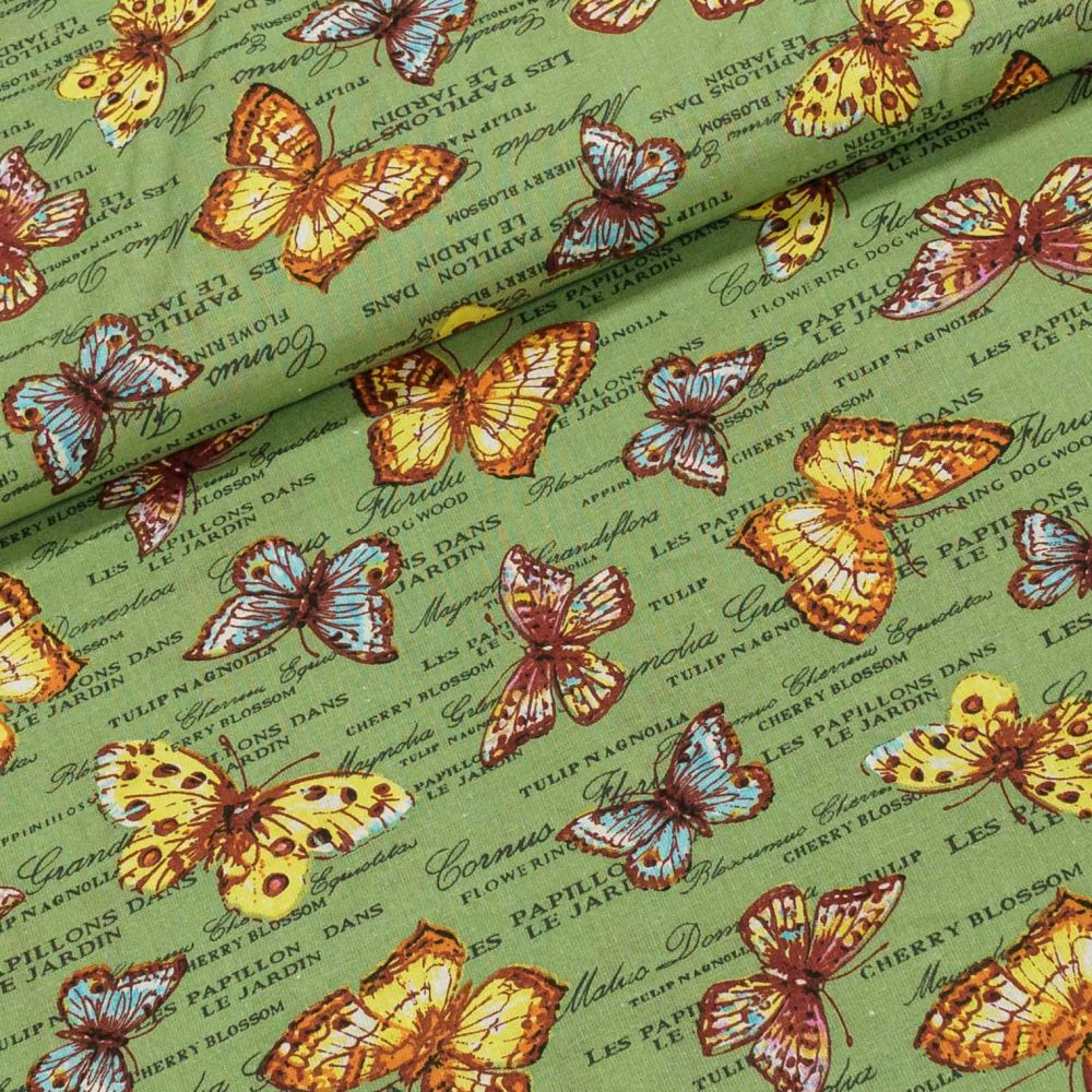 Bavlněné plátno motýli a nápisy na zelené, š.140cm (látka v metráži)