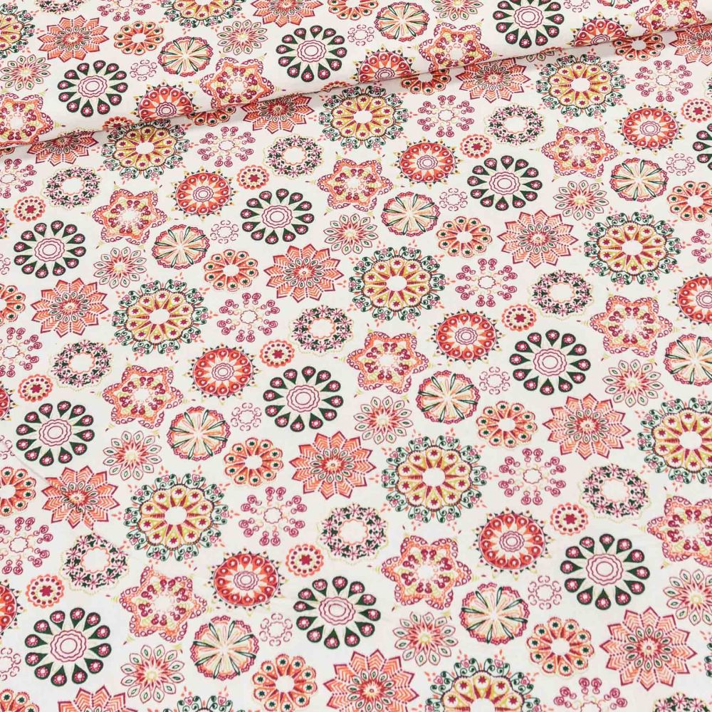 Bavlněná látka (tkanina) s oblíbených vzorem mandal v červených barvách. Látka je v šířce 160 cm, vyrobena ze 100% bavlny (gramáž 135g/m2) v plátnové vazbě. Vzor látky je natištěn jen z jedné strany z druhé strany je látka bez potisku.
