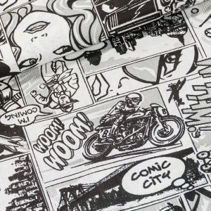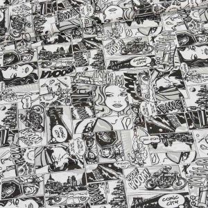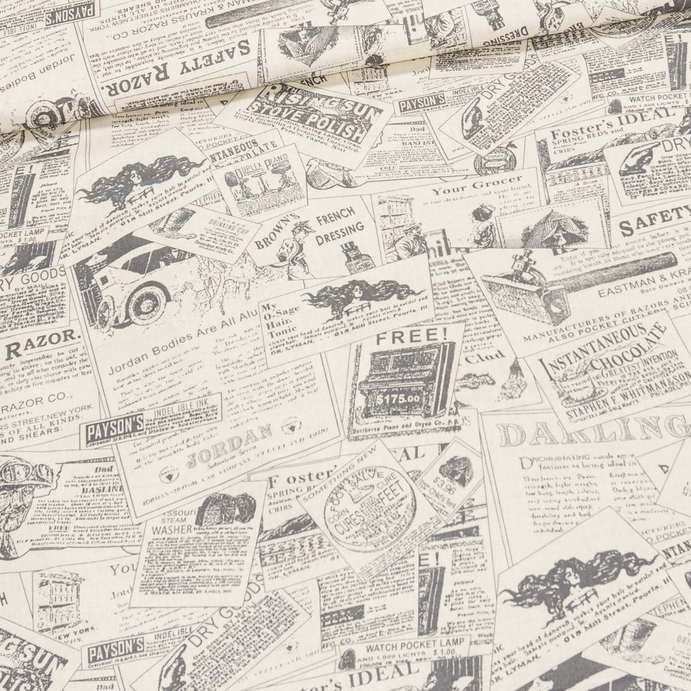 Bavlněná látka (tkanina) se vzorem novinového tisku na smetanovém podkladu. Látka je v šířce 140 cm, vyrobena ze 100% bavlny (gramáž 135g/m2) v plátnové vazbě. Vzor látky je natištěn jen z jedné strany z druhé strany je látka bez potisku.