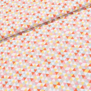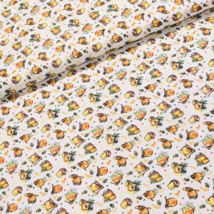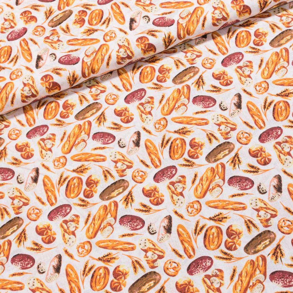 Bavlněná látka (tkanina) se vzorem pečiva a klasů obilí v oranžové barvě na bílém podkladu. Látka je v šířce 140 cm, vyrobena ze 100% bavlny (gramáž 135g/m2) v plátnové vazbě. Vzor látky je natištěn jen z jedné strany z druhé strany je látka bez potisku.