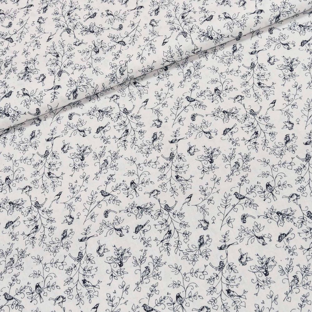 Bavlněná látka (tkanina) se vzorem ptáčků na větvičce malované perokresbou na smetanovém podkladu. Látka je v šířce 140 cm, vyrobena ze 100% bavlny (gramáž 135g/m2) v plátnové vazbě. Vzor látky je natištěn jen z jedné strany z druhé strany je látka bez potisku.
