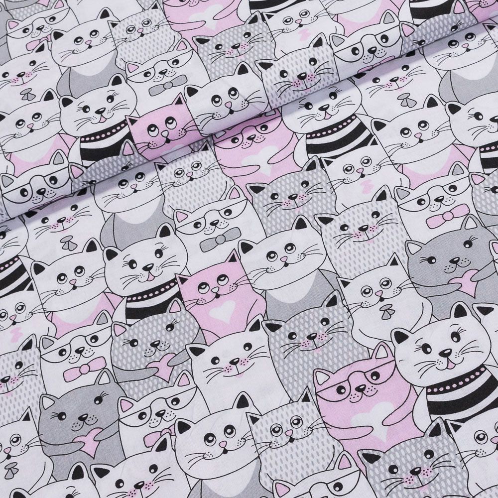 Bavlněná látka (tkanina) se vzorem růžových,šedých a bílých koček. Látka je v šířce 160 cm, vyrobena ze 100% bavlny (gramáž 135g/m2) v plátnové vazbě. Vzor látky je natištěn jen z jedné strany z druhé strany je látka bez potisku.