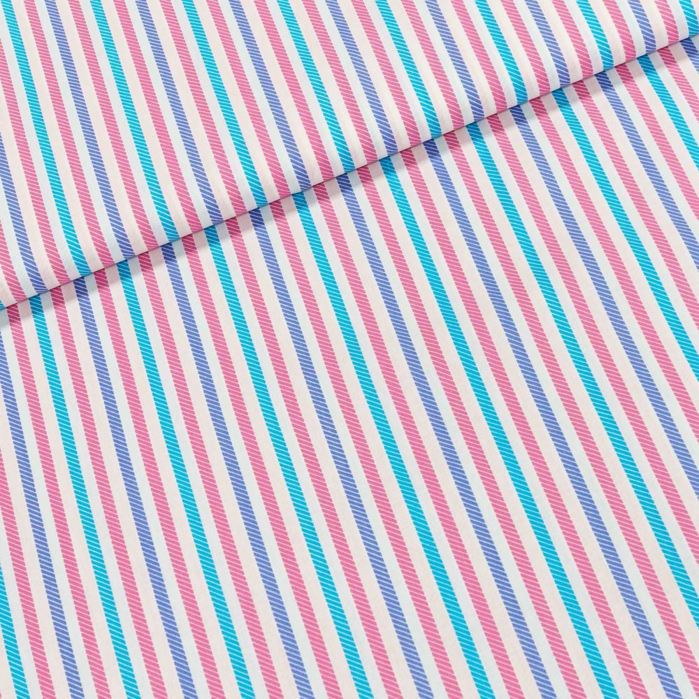 Bavlněná látka (tkanina) se vzorem růžového, modrého, fialového a bílého proužku. Látka je v šířce 140 cm, vyrobena ze 100% bavlny (gramáž 135g/m2) v plátnové vazbě. Vzor látky je natištěn jen z jedné strany z druhé strany je látka bez potisku.