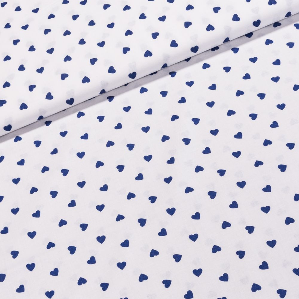 Bavlněná látka (tkanina) s motivem modrých srdíček na bílém pozadí. Látka je v šířce 160 cm, vyrobena ze 100% bavlny (gramáž 135g/m2) v plátnové vazbě a je potištěná jen z jedné strany z druhé je bez potisku.