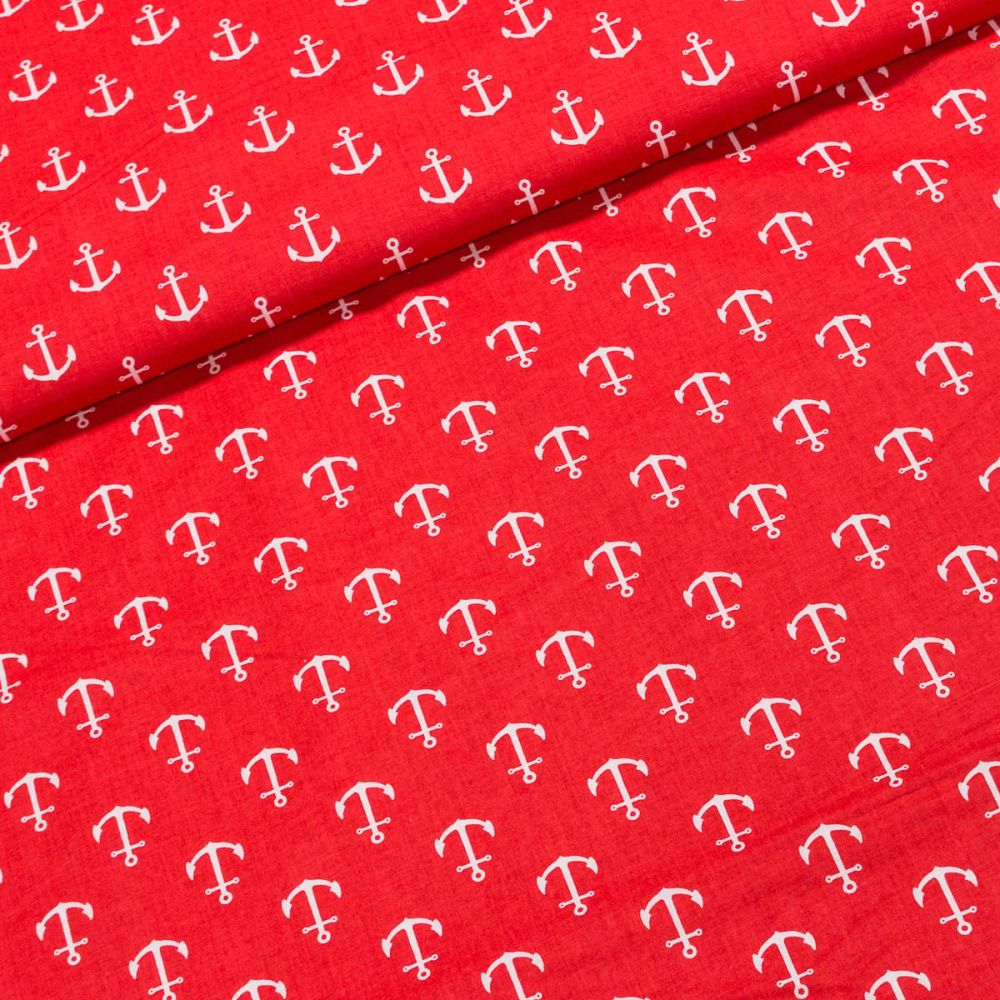 Bavlněná látka (tkanina) se vzorem bílých kotev na červeném pozadí. Látka je v šířce 160 cm, vyrobena ze 100% bavlny (gramáž 135g/m2) v plátnové vazbě. Vzor látky je natištěn jen z jedné strany z druhé strany je látka bez potisku.