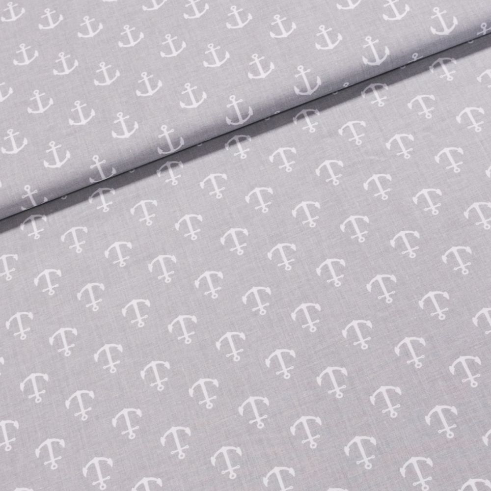 Bavlněná látka (tkanina) se vzorem bílých kotev na šedém pozadí. Látka je v šířce 160 cm, vyrobena ze 100% bavlny (gramáž 135g/m2) v plátnové vazbě. Vzor látky je natištěn jen z jedné strany z druhé strany je látka bez potisku.