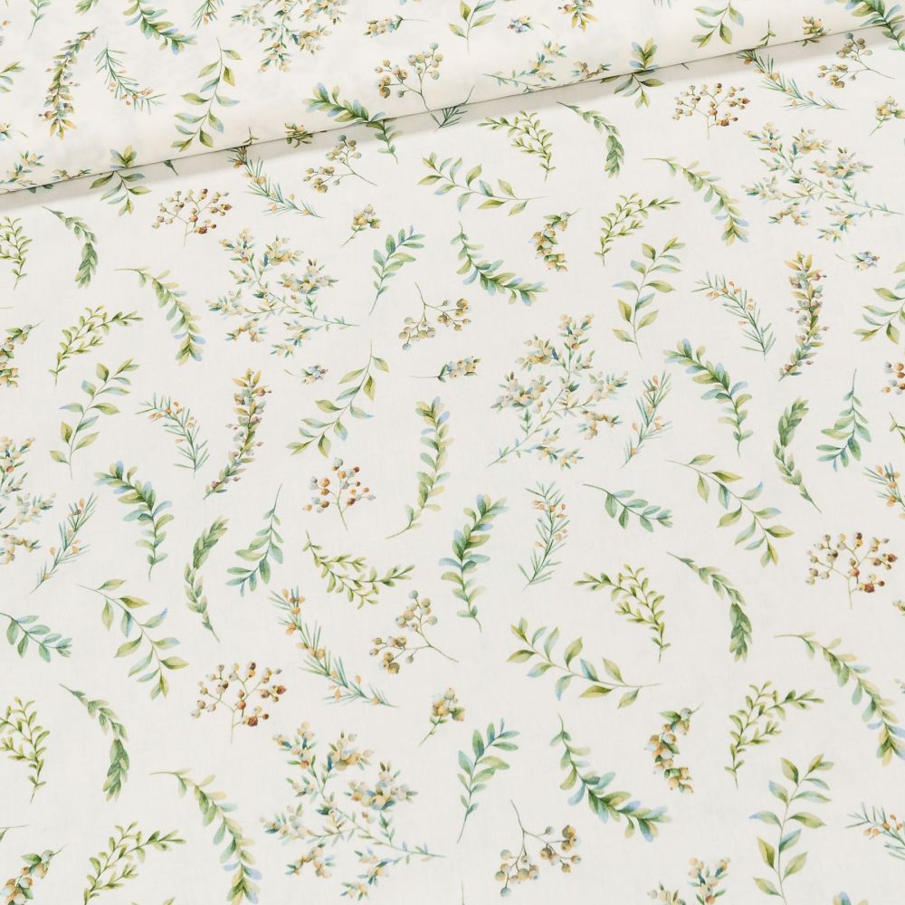 Bavlněná látka (tkanina) se vzorem zelených větviček na bílém podkladu. Látka je v šířce 150 cm, vyrobena ze 100% bavlny (gramáž 120g/m2) v plátnové vazbě. Vzor látky je natištěn jen z jedné strany z druhé strany je látka bez potisku.