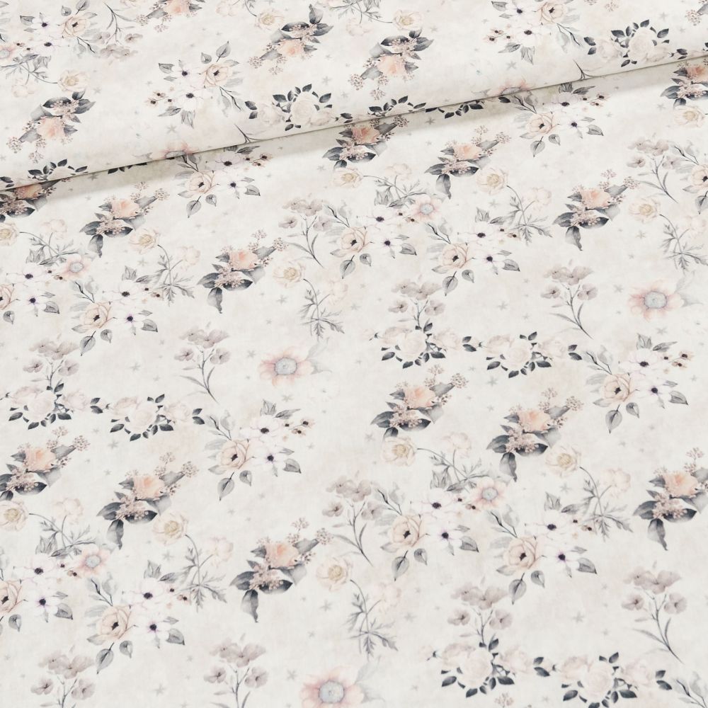 Bavlněná látka (tkanina) se vzorem lososových růžiček s šedými lístky na smetanovém podkladu. Látka je v šířce 150 cm, vyrobena ze 100% bavlny (gramáž 120g/m2) v plátnové vazbě. Vzor látky je natištěn jen z jedné strany z druhé strany je látka bez potisku.