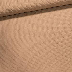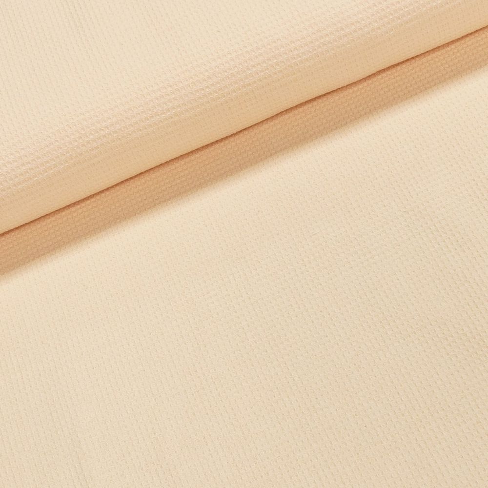 Bavlněná látka (tkanina) v jednobarevné světle meruňkové barvě. Látka je v šířce 150 cm, vyrobena ze 100% bavlny (gramáž 216g/m2) ve vaflové vazbě. Využití látky na dečky, podložky, peřinky do kočárků, kojeneckých košíků, hnízdečka pro miminka, nebo také na výrobu ručníků a utěrek či sukní, halenek, topů a pod. Látka je oboustranná.