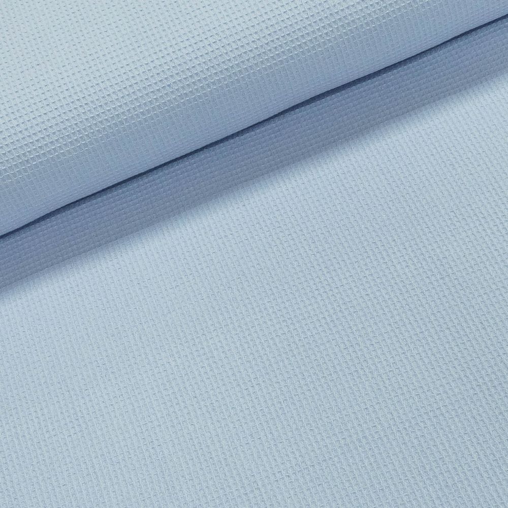 Bavlněná látka (tkanina) v jednobarevné světle modré barvě. Látka je v šířce 150 cm, vyrobena ze 100% bavlny (gramáž 216g/m2) ve vaflové vazbě. Využití látky na dečky, podložky, peřinky do kočárků, kojeneckých košíků, hnízdečka pro miminka, nebo také na výrobu ručníků a utěrek či sukní, halenek, topů a pod. Látka je oboustranná.