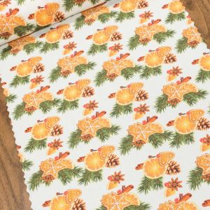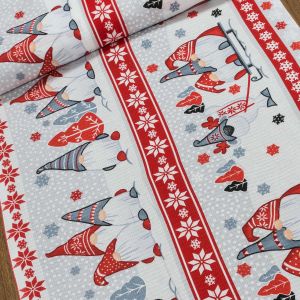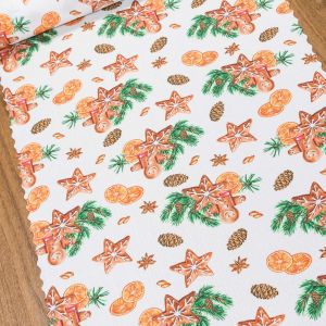 Bavlněná látka (tkanina) štola na metráž. Látka je v šířce 50 cm, vyrobena ze 100% bavlny (gramáž 175g/m2) s vaflovou vazbou. Látku lze použít na stůl jako jeden středový pruh nebo dva pruhy na šířku stolu nahrazující prostírání, použít lze i na utěrky. Vzor látky je natištěn jen z jedné strany z druhé strany je látka bez potisku.