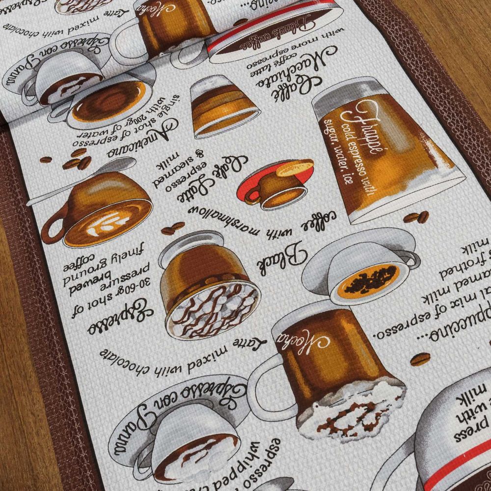 Bavlněná látka (tkanina) štola nebo také utěrkovina na metráž se vzorem kávy, kapučína, latté či espressa v béžových barvách. Látka je v šířce 50 cm, vyrobena ze 100% bavlny (gramáž 175g/m2) s vaflovou vazbou. Látku lze použít na stůl jako jeden středový pruh nebo dva pruhy na šířku stolu nahrazující prostírání, použít lze i na utěrky. Vzor látky je natištěn jen z jedné strany z druhé strany je látka bez potisku.