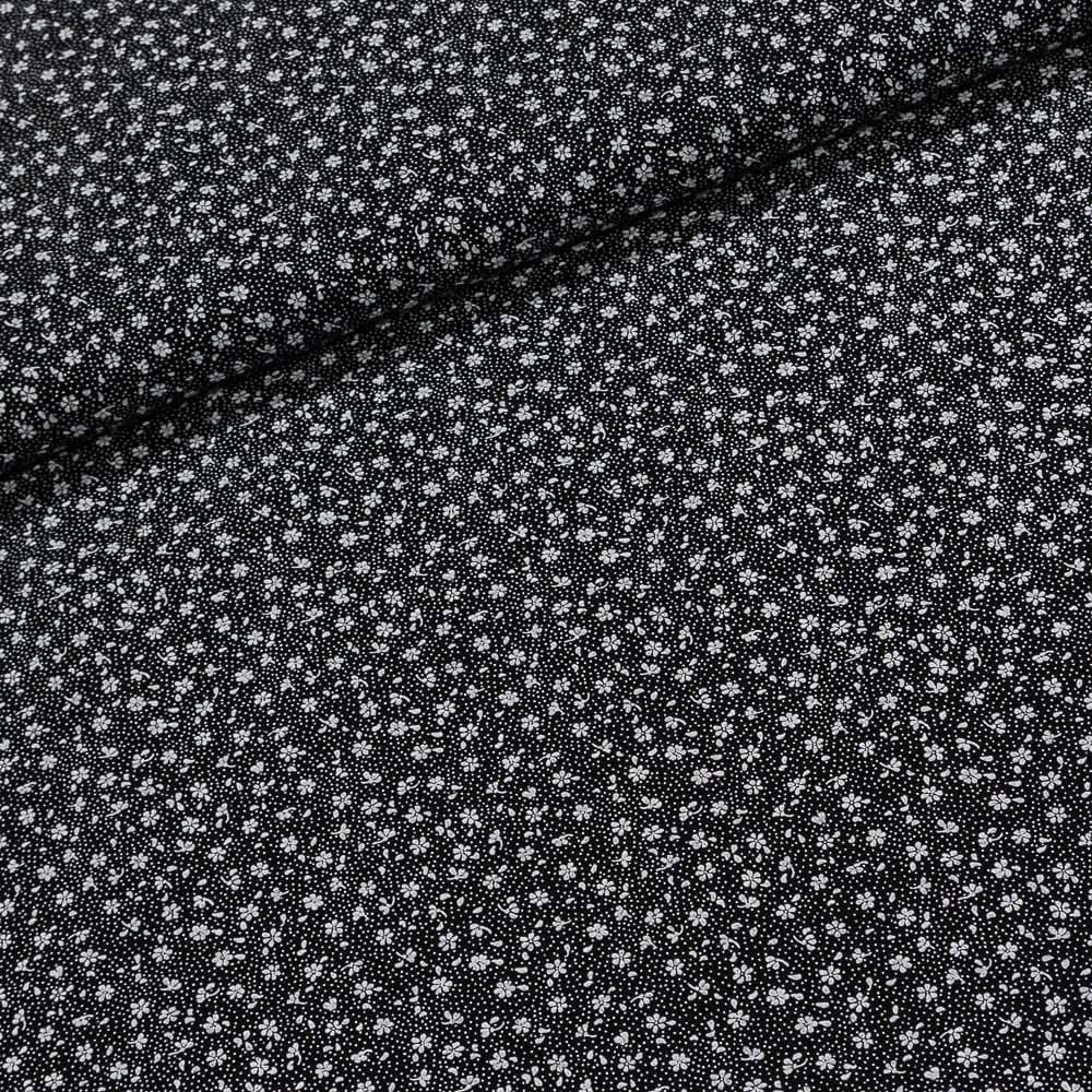 Bavlněná látka (tkanina) s motivem bílých květinek na černé. Látka je v šířce 160 cm, vyrobena ze 100% bavlny (gramáž 135g/m2) v plátnové vazbě. Vzor látky je natištěn jen z jedné strany z druhé strany je látka bez potisku.