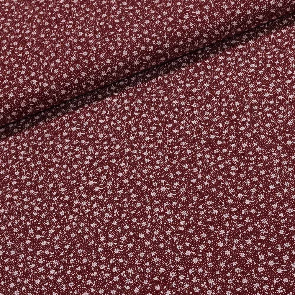 Bavlněná látka (tkanina) s motivem bílých květinek na bordó. Látka je v šířce 160 cm, vyrobena ze 100% bavlny (gramáž 135g/m2) v plátnové vazbě. Vzor látky je natištěn jen z jedné strany z druhé strany je látka bez potisku.